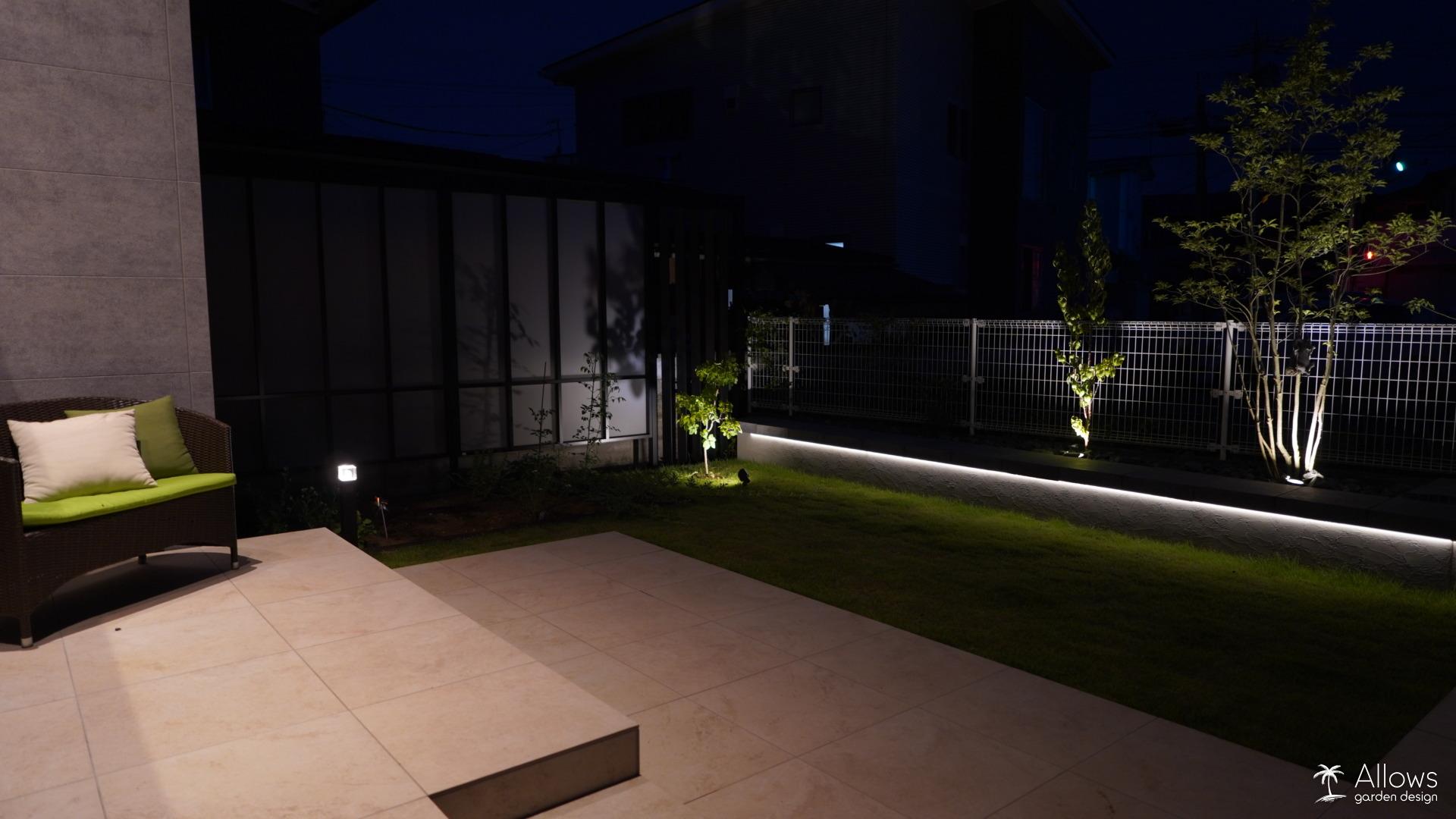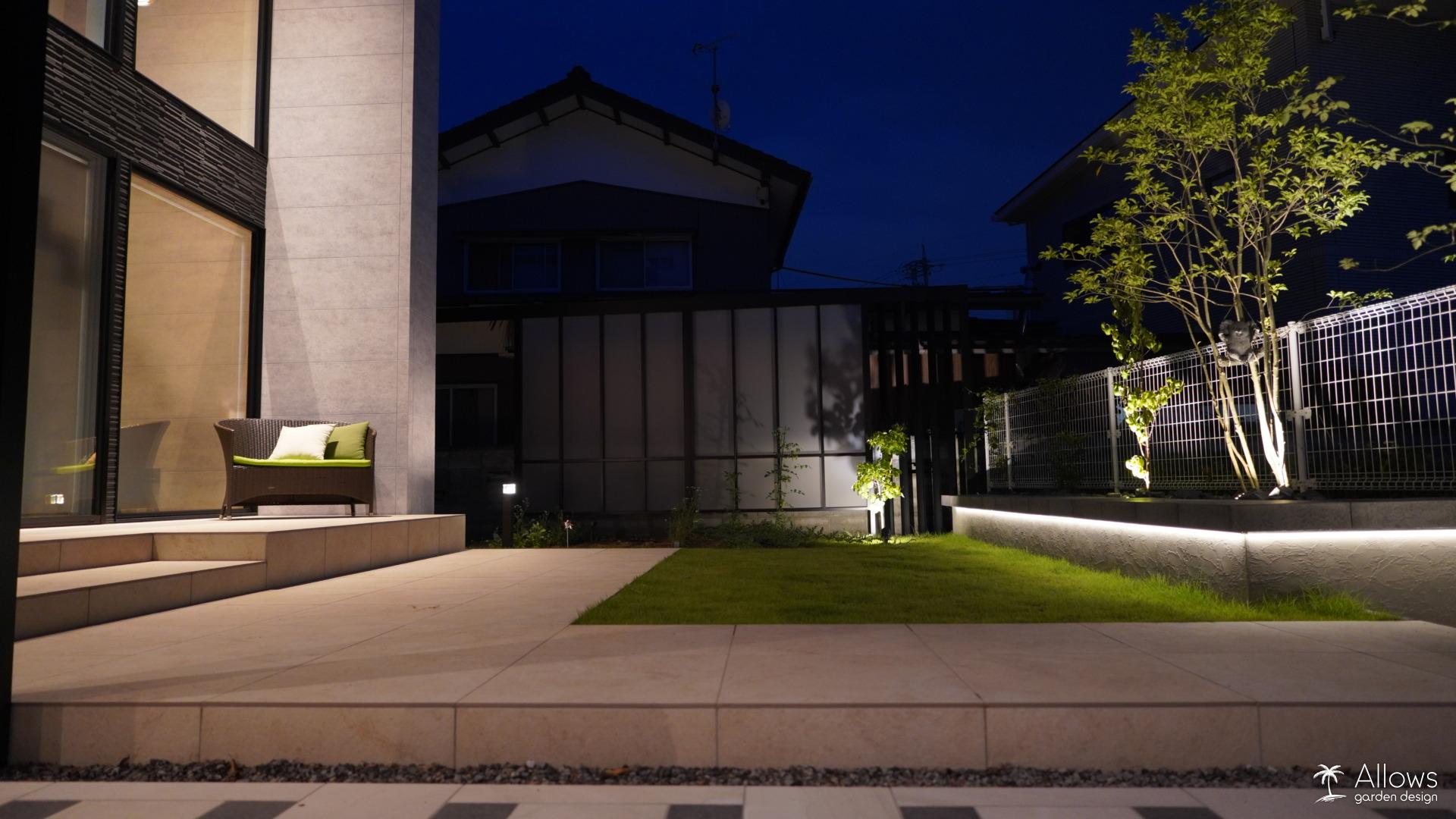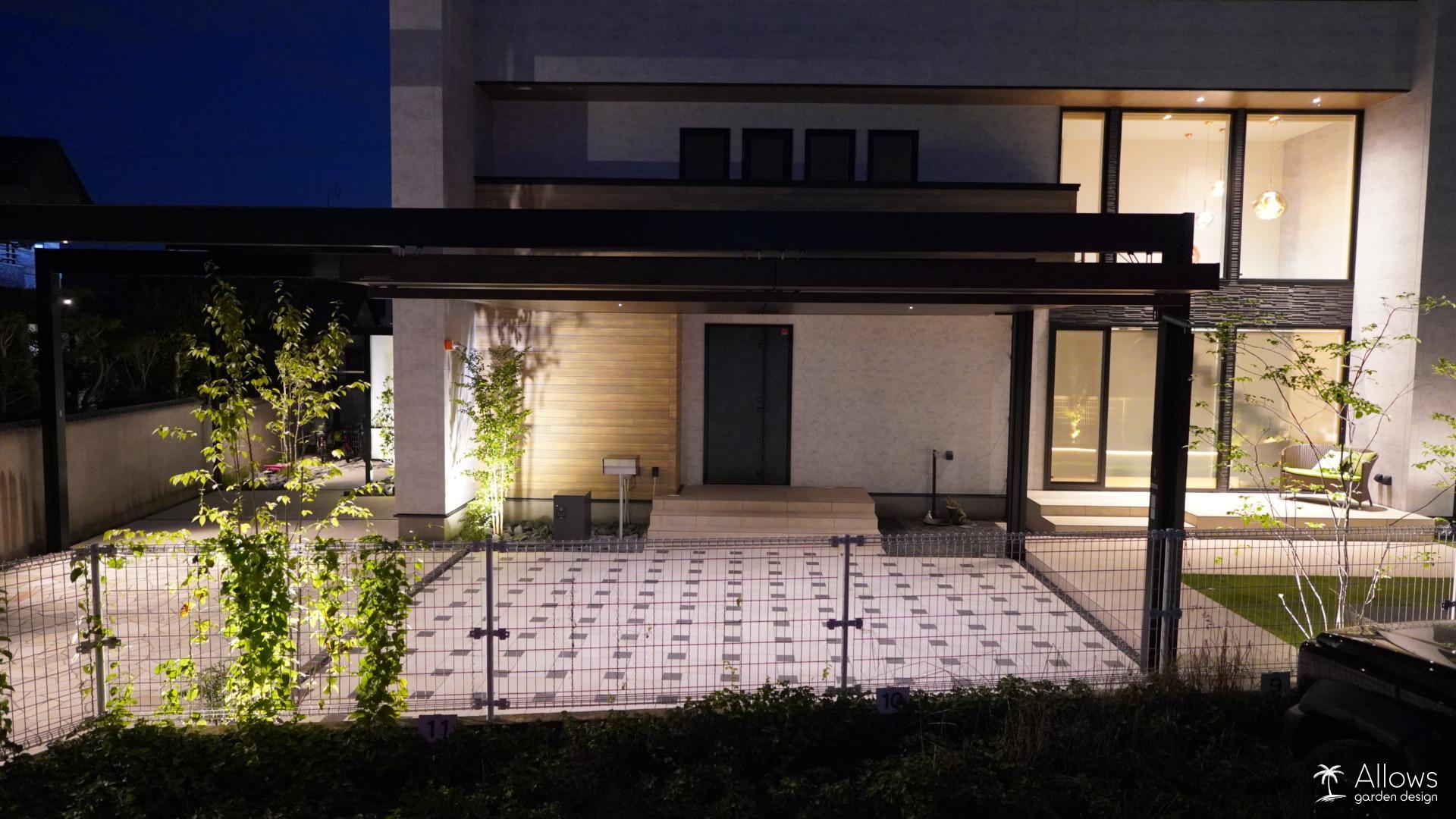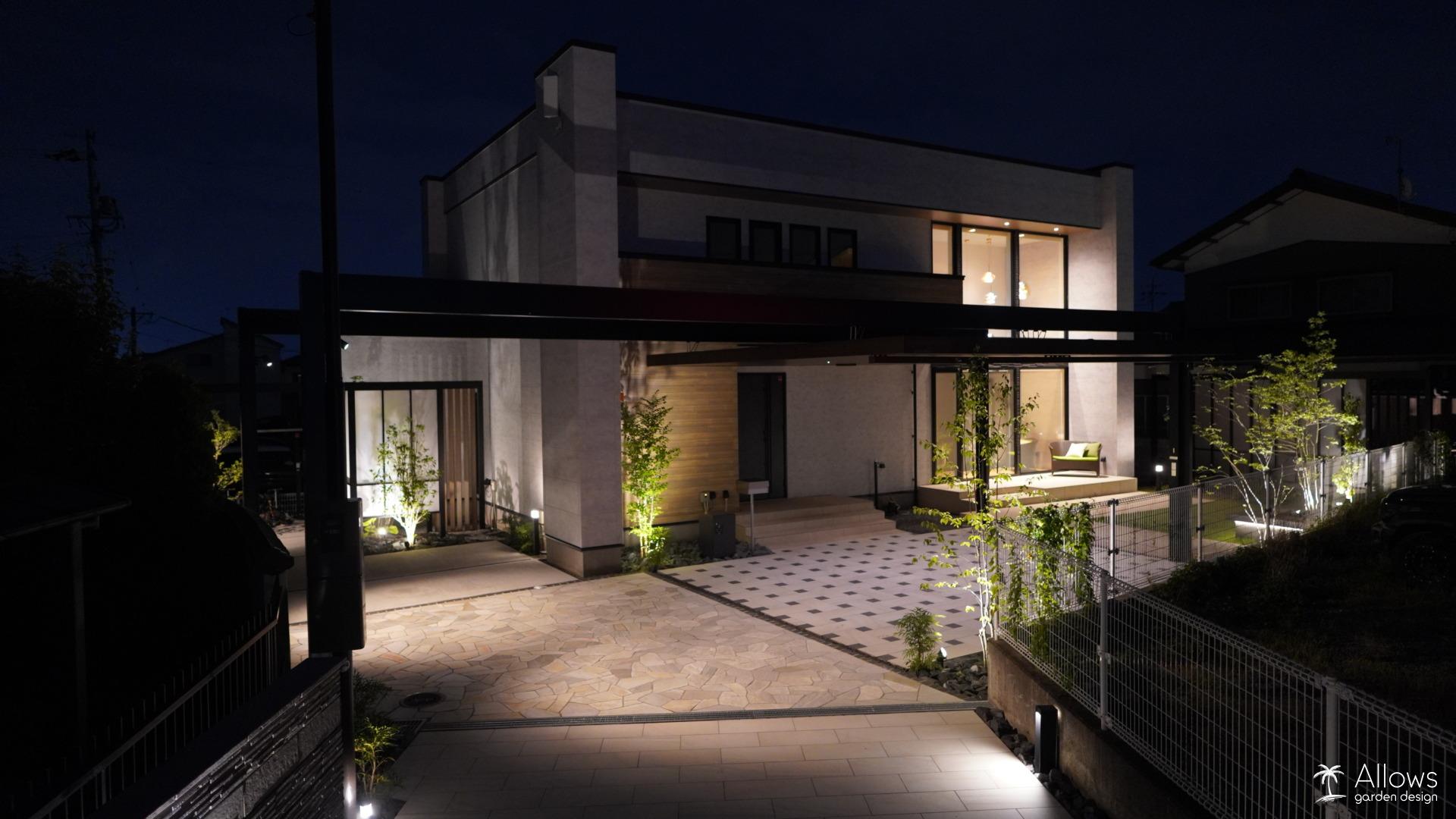 壁面の陰影、足元を導く光、そして樹木を照らす柔らかな輝き。 帰宅するたびに誇らしくなるような、上質な夜景を演出しました。