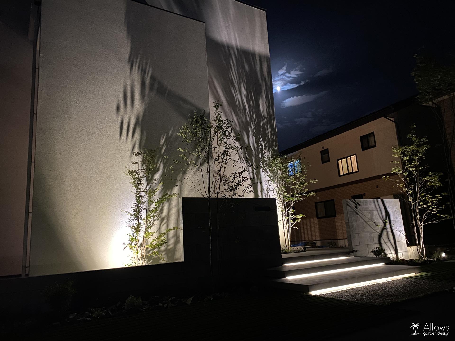 階段下の間接照明やシャドーライティングなど、「映える」光の演出にこだわることで、暗がりでも安全かつ幻想的なアプローチに。