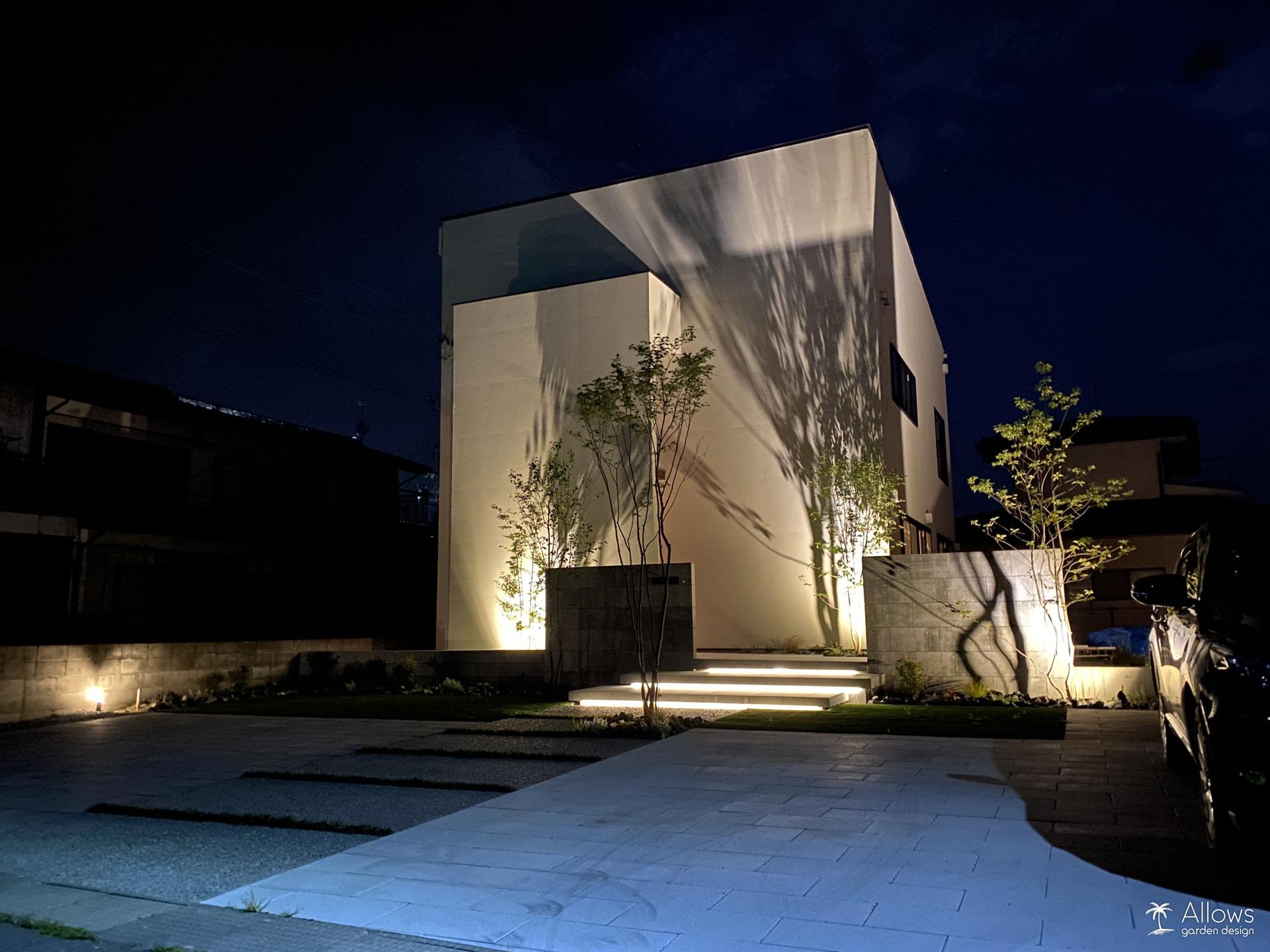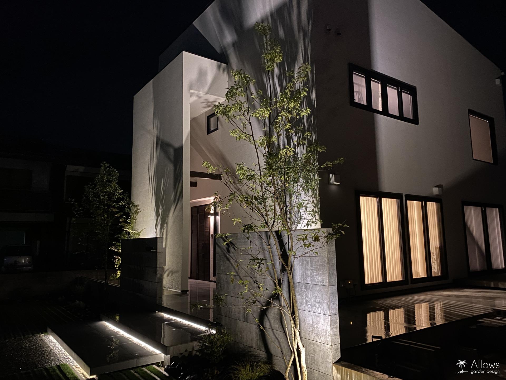 夜を迎えれば、計算されたライティングが白壁に樹木の影を映し出し、昼間とは一変したドラマチックな表情。